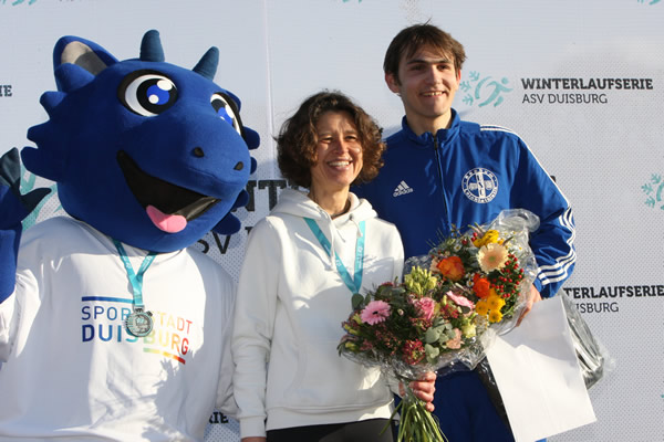 | Maskottchen DUBLU kommt wieder zur ASV-Winterlaufserie und wird den besten Teilnehmern gratulieren. Hier Doris Kluge-Schöpp von Freie Schwimmer Duisburg Running-Team und Elias Kroll vom USC Bochum zu ihren Siegen in der großen Serie der 40. Austragung |