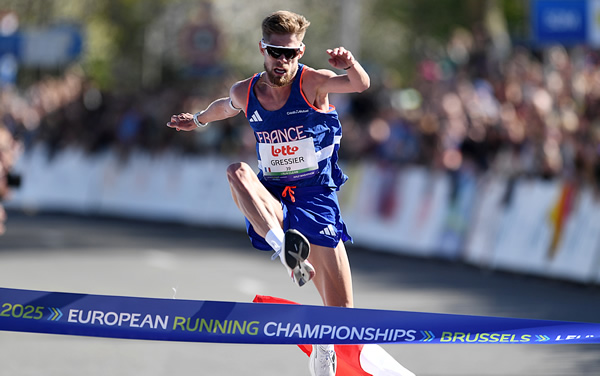 Was für ein beeindruckender Auftritt. Jimmy Gressier macht bei der Straßenlauf Europa-Meisterschaften in Leuven (BEL) von Beginn an Druck und holte sich am Samstag zum Auftakt der zweitägigen Titelkämpfe im Halbmarathon die Goldmedaille. Es ist zudem der erste internationale Titel in der Hauptklasse für den mittlerweile 27-Jährigen. Übrigens: Bisher wurden EM-Titel über die 21,1 Kilometer bisher nur im Rahmen der kontinentalen Titelkämpfe 2016 (Amsterdam) und letztes Jahr (Rom) ausgetragen. Mit der neuen persönlichen Bestzeit von starken 59:45 Minuten blieb der Franzose unter der "60-Minuten-Schallmauer" und ist damit aktuell die Nummer elf in der ewigen Europa-Bestenliste.