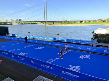 | Durch den Bogen auf die Zielgerade | Tolles Ambiente: Das Ziel lag genau am Rheinufer. Im Hintergrund sieht man die sogenannte Kniebrücke |