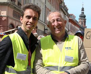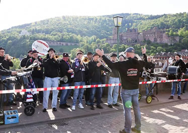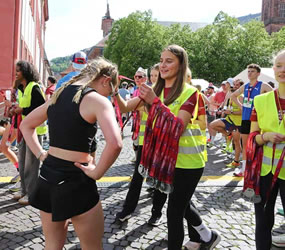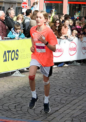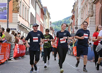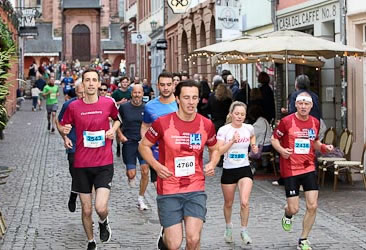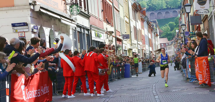 Wenn an der Spitze des Halbmarathons letzte Kräfte mobilisiert werden, um auf dem lange ansteigenden Schlosswolfsbrunnenweg keine Positionen zu verlieren, fast alle Langstreckler aber noch dem höchsten Streckenpunkt an der Moltkehütte 270 m üNN zustreben, geht in der Hauptstraße der Punk ab, steppt der Bär, beziehungsweise wird auch dem sportfernsten Touristen klar, warum er beidseits auf einen schmalen Streifen der Fußgängerzone verwiesen wird. Um dem Nachdruck zu verleihen, werden hunderte Meter der Hauptstraße mit Gittern abgesperrt. Kaum zu glauben, dass es noch keine 50 Jahren her ist, dass durch diese enge Gasse die aufkommensstärkste Straßenbahnlinie Heidelbergs und zudem der Kraftverkehr rollte und sich die Fußgänger auf dem schmalen Trottoir drängten. Jetzt fegten die Bambini und in unmittelbarer Folge die Teilnehmer des Henkel Team-Laufs durch die Fußgängerzone dem Universitätsplatz entgegen.