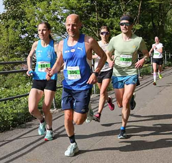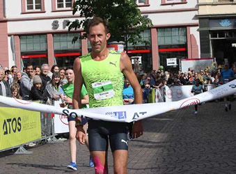 Doch vergebens. Simon Stützel, Jahrgang 1986 und im letzten Jahr der M35 zugehörig, mit einer Halbmarathon-Bestzeit von 1:03:29 h (Marathon pB 2:16:09) gab die Führungsposition bis ins Ziel nie ab und führt nun die ewigen Bestenliste des Laufs mit 1:09:31 h (1:09:30 netto) an. Seine Leistungssportkarriere hat der Spitzenläufer der LG Region Karlsruhe schon seit längerem für beendet erklärt, läuft nur noch dort, wo es im gefällt oder bei Läufen, die er noch nicht kennt und die ihm in seiner Vita irgendwie noch zu fehlen scheinen. Dass er dabei aber noch immer Streckenrekorde am laufenden Band aus dem Ärmel schüttelt, zeigt sein Können. Zudem spielen ihm seine Routine und die große Rennerfahrung in die Karten.