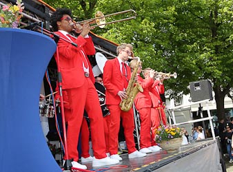 | Die mit den roten Anzügen (www.brass2go.de) sorgen am Ende auch auf dem Uniplatz mit heißen Rhythmen bis zur Siegerehrung für beste Stimmung | Ehrung der Top 3 des 42. ATOS Halbmarathon mit v.l.n.r. Simon Stützel, Stella Wernicke, Valerie Moser, Kathrin Lehnert, Bill Martin und Vasilii Leminskii |