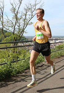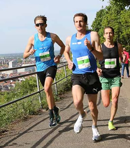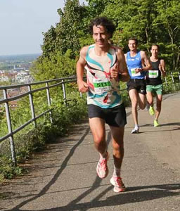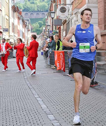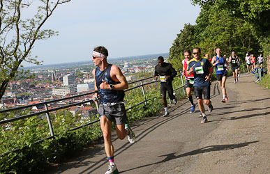 Schon auf dem Philosophenweg oberhalb der Alten Brücke hat sich der als Favorit gestartete Streckenrekordhalter Simon Stützel klar an die Spitze des Feldes gesetzt. Er gab vom ersten Meter an die Geschwindigkeit vor. "Der erste Kilometer ist leicht abfallend, wer da nicht klar unter drei Minuten läuft, bleibt eben zurück. Ich hatte Lust auf Begleitung, aber die anderen wohl nicht auf mich", wird er später berichten. Doch selbst bei großer Lauflust der Mitstreiter, er war eben noch schneller unterwegs als bei seinem Sieg im Vorjahr in Streckenbestzeit. Immerhin versuchten seine ärgsten Verfolger alles, um einigermaßen dran zu bleiben und auf eine Chance zu lauern.