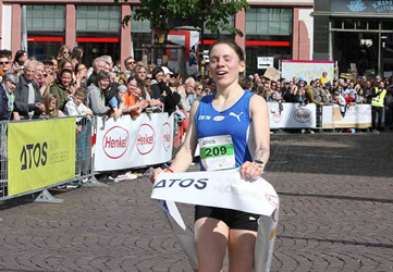 | Angefeuert von tosendem Publikumsapplaus und fetzigem Sound der Marching Band Brass2Go stürmt Stella Wernicke als erste Frau auf die letzten Meter in der Fußgängerzone Richtung Ziel |