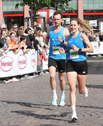 Weniger fordernd ist der Henkel Team-Lauf über 3,1 Kilometer, wenngleich auch dort an der Spitze erstklassige Zeiten erzielt werden. Mit 1045 Zielerfassungen und beinahe paritätischer Teilnahme von Frauen und Männern wäre der Begriff Rahmenprogramm vermessen. Der besondere Charakter dieses flachen Stadtlaufs ist die Teamwertung. Hier sei vorweg genommen, dass der 15jährige Henri Mihm in 9:38 min Schnellster bei den Männern und die 13jährige Emma Stonefield in 11:20 min Siegerin bei den Frauen wurde.