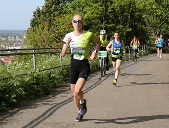 Weitaus spannender gestalteten die Frauen ihr Rennen, bei dem es sogar zu gelegentlichen Führungswechseln an der Spitze kam. Gespannt war man auf Kathrin Lehnert. Ihr wurden, begleitet von ihrem Lebenspartner Maximilian Walter, dem auf der Henkel-Runde ungeschlagenen Streckenrekordhalter, große Chancen auf den Sieg zugestanden. Beide nun im Trikot des AERA sports Team, das auch die Titelverteidigerin Michelle Hassel trug. Doch war der Kreis der Sieganwärterinnen damit längst nicht aufgezählt. Eine Vorentscheidung schien sich auf dem ansteigenden Philosophenweg anzubahnen, denn Kathrin Lehnert kämpfte um den Anschluss an ein Duo, dessen starkes Auftrumpfen nicht für alle überraschend war.