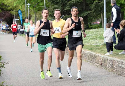 Unverändert blieb der Ablauf. Startaufstellung auf der abschüssigen Parkstraße für die Zehner. Etwa einen halben Kilometer entfernt erfolgte zeitgleich der Start in der Waldstraße für die Fünfkilometer-Teilnehmer. Während die Langstreckler nach einer Runde um den Gerbersruhpark den Stadtpark umrunden und nach fünf Kilometern genau auf den Spuren der Halbdistanzler in die Innenstadt und am Ende eine erweiterte Gerbersruhparkrunde absolvieren, die mit dem Einlauf auf das Kunststoffoval im Stadion ihr Finale findet, verlaufen sich dort bereits die vorausgeeilten Schnelleren des 5km-Rennens. Das ging wieder beides reibungslos zusammen, aber zusehends steigt das Risiko einer Kollision auf den Gegenrichtungsabschnitten. Gefahr bekannt, Gefahr gebannt. Bestimmt ergreift man bei der TSG rechtzeitig Maßnahmen, wenn die modernen Rennschuhe demnächst noch schneller machen.