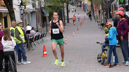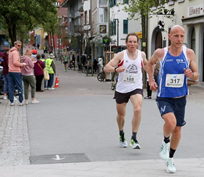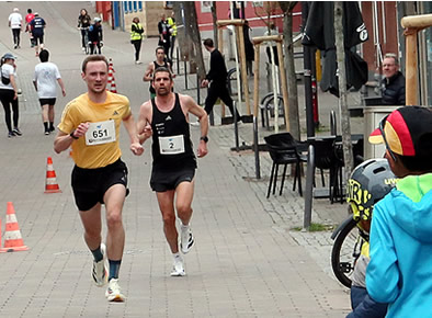 | In der Fußgängerzone bei 6,5 km ist aus dem Trio ein Duo geworden, mal angeführt von Dustin Uhlig ... | ... einen km später angeführt von Michael Chalupsky |