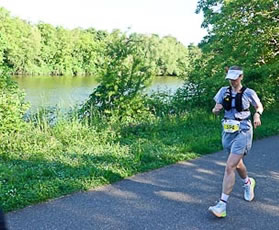 | Kaum aus der Stadt, schon reichlich Landschaft mit Neckarblick | Nicht nur Läufer blasen die Backen auf | Trompeten-Solo zur Motivation |