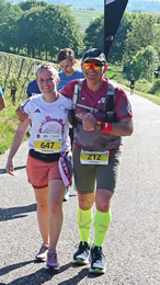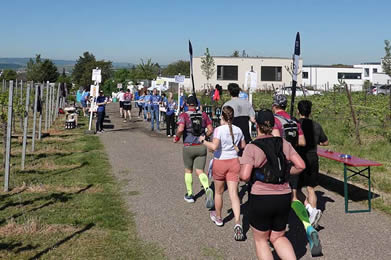 Nach einigen Kilometern mit netter Plauderei zieht sich das Feld im hinteren Bereich trotz deutlich höherer Teilnehmerzahl doch ordentlich auseinander. Unterschiedlich sind die Lauf-Taktiken, wie sich speziell auf dem letzten Drittel durch die Weinberge mit leichtem, aber stetigem Bergauf zeigt. Ordentlich marschieren kann durchaus hilfreich sein und für die letzten Laufkilometer noch Reserven bieten. Jedenfalls tun die sehr freundlichen Helferinnen und Helfer mit ihrem großartigen Getränke- und Obstangebot das Beste für die Motivation der Laufhelden. Auch bis zum letzten Finisher.