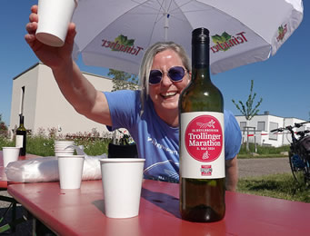| Moderator Achim Seiter mit Trolli-Frisur | Trinkbare Läufer-Zugabe: Eine Flasche Trollinger mit Marathon-Etikett | Trolli-Persönlichkeiten: Das Heilbronner Käthchen |