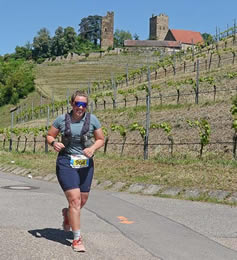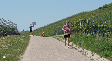 | Der höchste ist auch mal überwunden. Darüber freut sich auch Simone Specht | Beste Aussicht auf Läufer und Weinberge hat die Helferin bei km 29 |