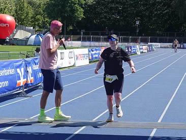 Der hat allerdings auf den letzten Kilometern Begleitung von besonderen Besen-Fahrzeugen. Aus zum Glück einiger Entfernung zeigt sich mir ein doch bedrohliches Szenario, das nach einem Agenten-Thriller anmutet: Eine schwarze Limousine und ein schwarzer Bus dahinter, so sieht es eher wie eine Verfolgung als eine Streckensicherung aus. Vielleicht hat mich die gerade laufende James-Bond-Filmmusik aus meinen Ohrstöpseln auf diese Gedanken gebracht. Wie meist im Film gibt es für den letzten Finisher doch noch ein Happy-End.