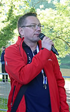 | Orga-Chef Holger Braun begrüßt die Marathonis | Die Elite ist schon unterwegs, wir warten grün beschirmt auf den Countdown der nächsten Welle | Fast 600 Teilnehmer beim Marathon am Start |
