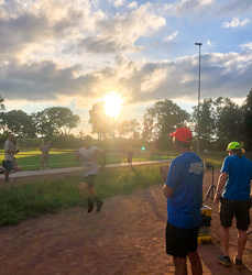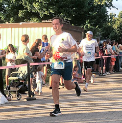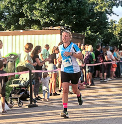 Um 19:45 Uhr dann der Startschuss für den 10 km-Lauf. Bei hohen Temperaturen und fordernder Schwüle, aber ohne den sonst allgegenwärtigen Wind vom Rhein her gingen deutlich über 400 Teilnehmerinnen und Teilnehmer auf die Strecke (im Ziel 431, davon 167 Frauen). An der Spitze formierte sich mit David Taylor (Clapham Chasers), Norman Korff (MTG Mannheim) und Massimiliano Bezzon (TSG 78 Heidelberg) rasch eine Dreiergruppe, während mit Alicia Koßmann (SG Leutershausen) und Leonie Gieser (LCO Lorsch) auch die zwei schnellsten Frauen lange gleichauf lagen.