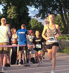 Auch Leonie Gieser plant eine Doppelbelastung: Sie hat für den Stadtlauf in Dieburg am Samstag gemeldet. Bis gut einen Kilometer vorm Ziel blieb sie noch in Sichtweite von Koßmann und nahm dann deutlich Tempo raus. Aber auch vorher hatte sie das Gefühl, dass ihre Konkurrentin jederzeit noch zulegen könne. Während Koßmann zuletzt in Pfungstadt mit 4:29 min. über 1500m glänzte und über 5000m eine sub 17 anpeilt, liegen Giesers Stärken eher auf den längeren Strecken. Beim Heidelberger Halbmarathon wurde sie starke Fünfte, ansonsten peilt sie den Marathon in Berlin an.
