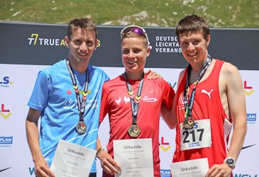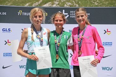 Ein Lachen im Gesicht verrät die Zufriedenheit bei Julia Ehrle, die am Vortag noch einen Pflichtlauf in Richtung U20-EM in Bergen/ Norwegen in Mannheim zu absolvieren hatte. Mit 17:32,09 gewann sie in Mannheim das 5000 m-Rennen vor Franziska Drexler (17:37,29), Ada Werner (17:37,53) und Emily Junginger (17:45,02) und ebnete damit den Weg zum 5000 m-Rennen bei den U20-Europameisterschaften. Und wenige Stunden später gab sie eine Kostprobe ihres Talents am Berg, ihrem geliebten Terrain. "Ich bin allerdings nach Oberstdorf gekommen und wollte vor Ort entscheiden, ob ich an den Start gehen kann oder nicht. Die Option war natürlich, zuschauen und meinen Bruder anfeuern!" Doch Julia hatte "gute Beine" und war im Ziel "nur glücklich", wie sie mit umgehängter Bronzemedaille erleichtert zugab. "Nina und Laura sind schon krasse Konkurrentinnen, da muss ich mich nicht verstecken!" Dass die 18jährige zudem auch U20-Meisterin wurde, das ist dann schon eher eine Randnotiz. Übrigens: U23-Meisterin wurde die Gesamtzwölfte Julia Rath.