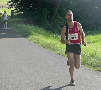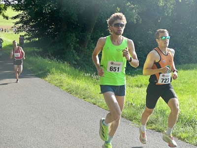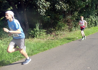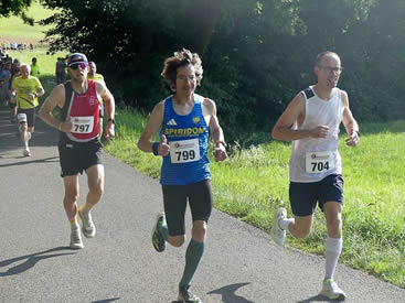 | Dmitrii Korneev aus Eschborn (linkes Foto; 810) dominiert den 10 km Lauf souverän. Der hinter ihm laufende Lennard Herber verliert früh den Anschluss, behauptet aber seinen zweiten Platz sicher | |