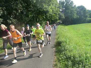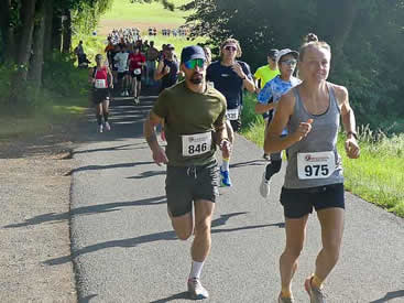 Auch diese Strecke verlief nicht ohne Ecken und Kanten und war ebenfalls von einem sehr welligen Profil gekennzeichnet. Gesamtsieger Maximilian Evert vom TV Petersberg war der einzige im Feld, der die bei ambitionierten Freizeitläufern sehr begehrte 20-Minuten-Schallmauer durchbrechen konnte. Da er nicht nur der Schnellste, sondern auch einer der jüngsten Teilnehmer im Feld war, kam er in einer Zeit von 19:54 min. auch zum Sieg in der MU 18. Schon weit abgeschlagen sicherte sich in 20:46 Lokalmatador Heiko Müller (LT Unterreichenbach) den zweiten Platz sowie den Sieg in der MHK. Der letzte freie Podestplatz ging an Lukas Grohe, der nach 21:46 min. auch den zweiten Platz in der MHK erzielen konnte.