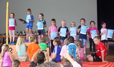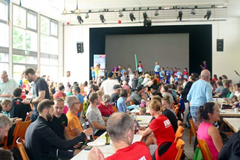 | Gut besetzte Goldberghalle im Saal und auf der Tribühne bei den Siegerehrungen von Altersklasse U6 bis 75 | |