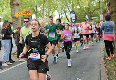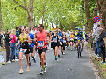 | Dichtes Marathonfeld in der Aegidiistraße Richtung Aasee, an dem die erste Staffelübergabe (km 10,5) stattfindet | |