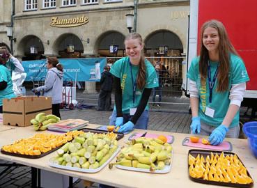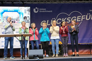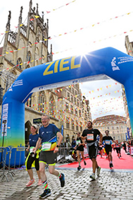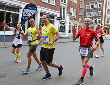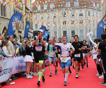 | Die Teilnehmer des 10km Charity-Lauf, 6,2km Gesundheitslauf und des Kids-Marathon über 1,5 km, an unterschiedlichen Stellen gestartet, laufen gleichfalls auf dem Prinzipalmarkt ein | |