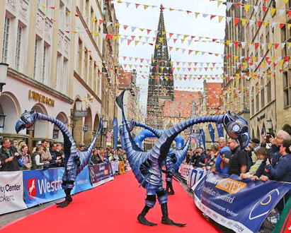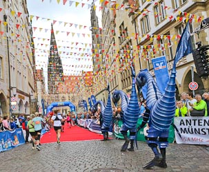 | Neben Cheerleadern, Bands und Trommelgruppen finden sich beim Volksbank-Münster-Marathon auch immer wieder Fabelwesen an der Strecke ein. In diesem Jahr die Aliens - blaue, wasserlebende, vogelähnliche Wesen - der niederländischen Künstler Close Act closeact.nl, die mit ihrer Höhe von ca. 3 Metern doch recht beeindruckend sind | |