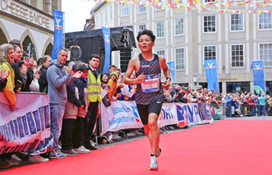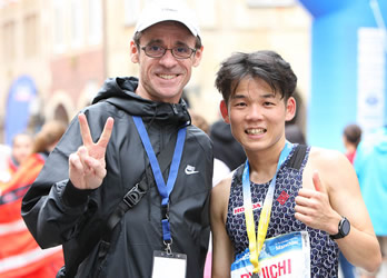 | Der Japaner Ryuichi Yoshioka läuft auf Rang 7 und freut sich mit Betreuer Brett Larner über die schnelle Zeit auf Münsters Pflaster | |