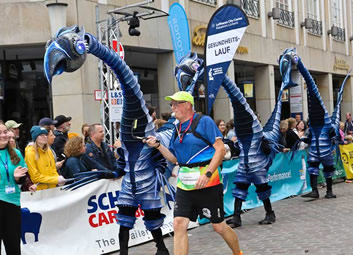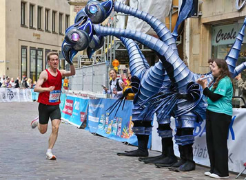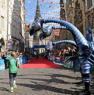 Beim 23. Volksbank-Münster-Marathon spielte das Wetter mit und ein Hitzerennen, was man in Münster auch schon erlebt hatte, fand diesmal in Berlin statt. Mit 790 Studierende im DZ-Hyp Studicup hat sich deren Zahl mehr als verdoppelt. Es gibt ihn also, den Nachwuchs auf der Marathonstrecke. Aus den Reihen der Passanten ist aufzuschnappen, wie sehr sie das Ausdauersportspektakel bewegte. Die Künstler werden immer wieder erwähnt, abgefragt, ob man auch dieses und jenes gesehen habe. Die überdimensionalen Stelzenfiguren Close Act, blaue Aliens auf Flossen, Akrobaten, die Afrikameile, dazu die Hotspots mit Musik, die kann man auf engem Raum in der Innenstadt erleben.