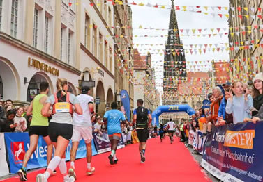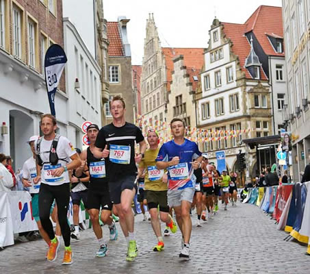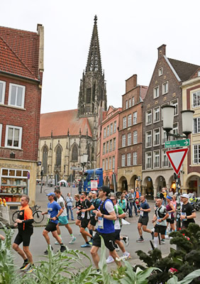 12.089 Anmeldungen lagen zum Meldeschluss in Münster vor, ein absolutes Allzeithoch. Und allein 4115 davon wollten Marathon in der westfälischen Metropole laufen, ein Zuwachs von 1240 Marathonläufern. Derlei Zunahmen lassen die weiteren Programmpunkte gar nicht zu, die meist zu einem sehr frühen Zeitpunkt ausgebucht sind. Beliebt ist der Staffelmarathon, bei dem sich je 4 Läuferinnen oder Läufer die 42,195 Kilometer aufteilen. Auch der 2/3 Marathon erfreut sich regen Zuspruchs als Annäherungsdistanz zum ersten Marathon oder für all jene, die 28 Kilometer schaffen, aber 42 Kilometer eben nicht mehr. Beim Charity-Lauf über 10 km und dem Gesundheitslauf über 6,2 km, beide ohne Zeitnahme, ebenso beim 1,5 km langen Kids-Marathon, kommen die Teilnehmer in den Genuss des überwältigenden Marathonfinales, laufen gleichfalls auf dem Prinzipalmarkt über den roten Teppich unmittelbar vor dem historischen Rathaus mit seinem berühmten Friedenssaal ins Ziel. Sonderwertungen für Handwerker, Studierende und Mitarbeitende der Volks- u. Raiffeisenbanken tragen mit wachsendem Zuspruch einen Teil zum Gesamterfolg bei.
