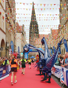| Begegnung mit ultragroßen Blue Birds kurz vor dem Zieleinlauf von Ultramarathonläufer Johannes Arens vom TG Kitzingen. In der Nationenwertung bleibt ihm nur Rang 4 | |