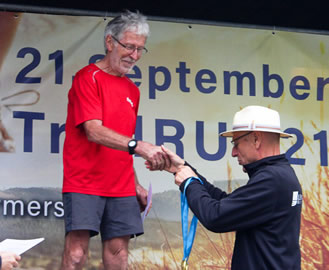 | Der Präsident des BLV Michael Schlicksupp bei der Siegerehrung. Hier der M75 Sieger Siegfried Blum | |