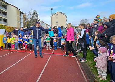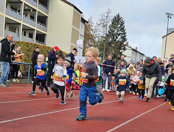 Bevor es in die TSV-Halle gehen konnte, erfolgten ab 11:15 Uhr der Schülerlauf über 400m und der Bambinilauf über 200m, mit zusammen über 150 jungen Starter:innen eine feste Größe in Berghausen. Bevor die Starts erfolgen konnten, wurden die Eltern gewarnt: "Bitte lasst die Kinder alleine laufen! Lauft nicht mit ihnen an der Hand, sie sollen nicht über die Strecke gezogen werden!" In den meisten Fällen klappte das sogar.