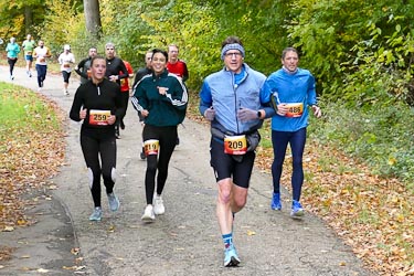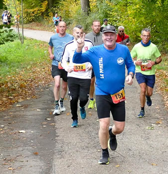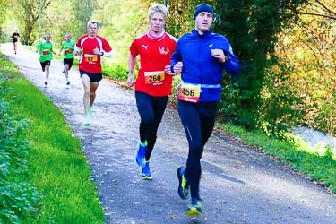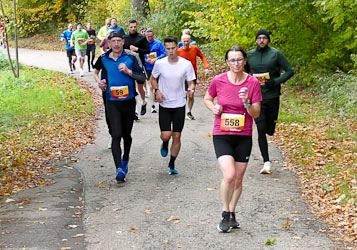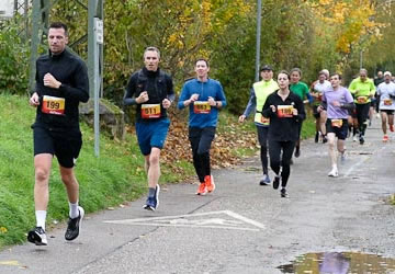 Bernhard Stobitzer warnte davor, die Kurven zu schnell zu nehmen. "Die Gemeinde hat mit viel Aufwand versucht, das ganze Laub von der Strecke zu räumen. Das Ergebnis - naja, das seht ihr dann selbst. Seid vorsichtig, dass ihr nicht wegrutscht!" Die vermessene Laufstrecke führte wie jedes Jahr zunächst durch Söllinger Wohngebiet und nach dem Durchlaufen einer Unterführung in Richtung Kleinsteinbach. Ungefähr zwei Kilometer führten durch den Wald und leicht wellig konstant nach oben, bevor man den Wendepunkt erreichte und dann wusste: nun geht es vorwiegend abwärts. Gut 40 Höhenmeter sind auf der Pfinztallaufstrecke zu absolvieren, die drosseln schon das Tempo.