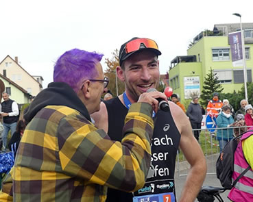 | 10 km Sieger Jens Mergenthaler knackt die 30 Minuten Marke | Und sogleich bereit um bei Moderator Achim Seiter Rede und Antwort zu stehen |