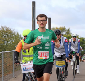 Zurück zum Führenden: Der Livetrack zeigt seinen Einlauf nach 2:41:08h (danke für den Service, der gerade für uns als Berichtende hilfreich ist, um Bild- und Texterstellung zu optimieren!). Sieger Sören Ulbrich hat das ABC der Leichtathletik bei der SG Motor Thurm "gelernt", ehe er sich auf das Triple des Ausdauersports konzentrierte: den Triathlon. Mit den Siegen in Unterdistanzrennen (Mülsengrundlauf: 9,5km in ca. 34 Minuten und Swim&Run beim Halle Triathlon) hat der Triathlet noch einmal "Laufkörner" für den "MM" getankt. Fast vier Minuten legt er zwischen sich und den Zweitplatzierten Olaf Henkel vom SV Turbine Neubrandenburg (2:45:02h). Der in der Altersklasse M50 startende Ausdauerläufer aus Mecklenburg-Vorpommern kann unter anderem eine Halbmarathonzeit von 1:18:49h aufweisen; über 10 Kilometer steht eine 36er-Zeit in seiner Laufvita. Eine dreiviertel Minute dahinter finisht Louis Hellmuth vom SCC Berlin.