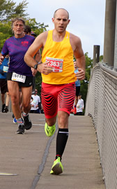 Die Spitzengruppe der Marathonis hat da die Wendeschleife bereits passiert. Der Führende und spätere Sieger, Sören Ulbrich, konnte schon beim ersten Durchlauf des Elbauenparks einen gehörigen Vorsprung zwischen sich und seine Verfolger legen. Fast unbemerkt taucht der "gelernte" Triathlet auf der schmalen Brücke zwischen den 10km-Läufern auf, wäre da nicht das Streckenfahrrad gewesen. Gerade bei solch engen Passagen wie auf der Fußgängerbrücke in Richtung Seebühne ist es schwierig, das Lauftempo zu halten, wenn nicht der Weg gebahnt wird. Anders auf der Sternbrücke, die derzeit für den Verkehr offen ist: Diese Elbüberquerung wurde für den Verkehr gesperrt, und auch das baustellenbelastete Schleinufer gehört zum Streckenverlauf, der im Übrigen mit dem des Vorjahres identisch war. Auf besagter Brücke zieht sich die Läuferschlange auf beiden Fußwegen sowie der Straße hin.