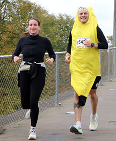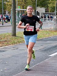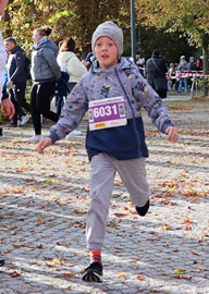 Der teils stürmische Wind hat einige Wege in der Nähe des Ziels mit Kastanien übersät. ("Der Herbst, der schenkt uns blankes Gold, das auf der Straße hüpft und rollt, Kastanien sind`s, die uns erfreuen, kommt, sammelt alle ein ") Der Wortlaut eines Kinderliedes aus längst vergangenen Tagen wird auf den letzten Metern hin zur Herrenkrugstraße für einige Läuferinnen und Läufer aktuell. Aber die Rasenstreifen links und rechts der Wegstrecke dienen als Ausweichmöglichkeit. An der Wegkreuzung reihen sich 10km-Teilnehmer und die vielen Minimarathonis in eine Läuferschlange ein, die dann nach ca. zweihundert Metern Richtung Ziel zwischen den Messehallen einbiegt.