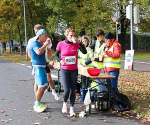 Einige Helfer an der Wendeschleife zur zweiten HM-Runde reichen den Marathonis Wasser, Iso-Getränke und Cola. "Bananen gehen auch, aber Äpfel (frisch geschnitten und wirklich lecker) wollen die Läuferinnen und Läufer nicht." |
