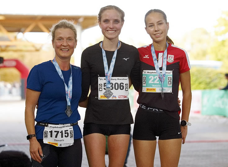 | Frauenpodest über 10 Kilometer mit Siegerin Jule Vetter (W20) aus Tübingen, 2. Natalie Albrecht (U18) vom SC Magdeburg und 3. Damaris Gericke (W45) vom Team Laufenten |