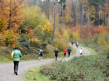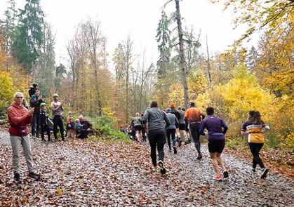Na ja, ganz so ist es dann doch nicht. So wie das Auf und Ab wechselt, ist auch der Streckenbelag mal befestigter Waldweg oder auch Trampelpfad, mal kiesig oder Matschepampe, getarnt von Herbstlaub. Wurzelwerk ist neongrün besprüht und damit gut erkennbar. Auf jeden Fall nie langweilig.