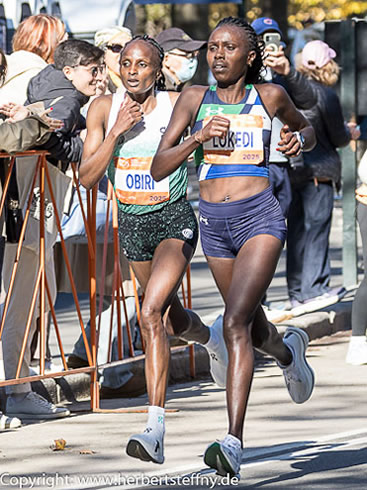 Bei 10 Kilometern wurde es bereits schneller. In 33:53 Minuten lief die Titelverteidigerin Sheila Chepkirui in Richtung 2:22 Stunden. Das Feld reduzierte sich auf 13 Läuferinnen. Auf der Pulaski Bridge entgeht der Elite wahrscheinlich die Aussicht auf die sich ständig wandelnde Skyline Manhattans, hier war die Halbmarathonzwischenzeit mit 1:11 Stunden auf Kurs Streckenrekord. Die Kenianerinnen Chepkirui, Obiri und Lokedi übernahmen die Führungsarbeit. Nur die US-Amerikanerin Fiona O'Keeffe konnte Kontakt halten. Sifan Hassan war leicht zurückgefallen, schloss aber bei 30 Kilometern wieder zu der Vierergruppe auf. Bei 35 Kilometern im wellig nach oben führenden Central Park war das Kenia Trio unter sich. O'Keeffe hatte bereits 38 Sekunden Rückstand und Hassan über eine Minute, aber das Tempo zog weiter an. Bei 40 Kilometern waren die beiden Dauerkontrahentinnen Lokedi und Obiri wieder unter sich und liefen nebeneinander zu einem spannenden Finish, dass diesmal anders als in Boston im Frühjahr Obiri für sich entschied. Mit 6:53 Minuten für die letzten 2,195 Kilometer bergan auf der 59th Street drehte sie diesmal den Spieß um und brach den Widerstand ihrer Landsfrau, die 16 Sekunden dahinter einlief.