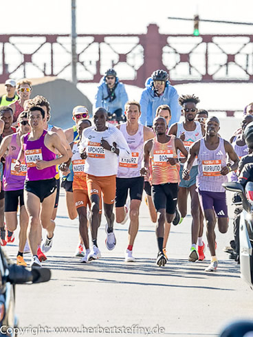 Die sehr guten Wetterbedingungen boten jedenfalls beste Voraussetzungen für ein Rekordrennen, sei es bei den Finisherzahlen, bei der Jagd der Elite auf die Streckenrekorde oder bei den Bestzeiten der Freizeitläufer, wobei die rund 350 Höhenmeter der Strecke das Tempo ein wenig einbremsen. Über sonniges Wetter bei 9 bis 14 Grad Celsius bei wenig Wind freuen sich nicht nur die Teilnehmer, sondern auch die Zuschauer und die Fotografen. Alles Vorzeichen für ein richtig schönes Marathonfest. |