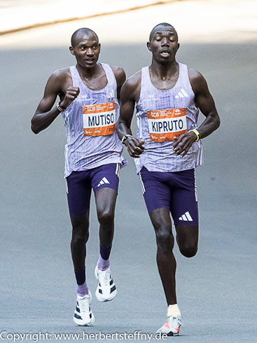 | Männer bei Halbmarathon - Eliud Kipchoge noch in vorderster Reihe, rechts der spätere Sieger Kipruto | Zweikampf Nr. 2 bei Meile 25 - Mutiso und Kipruto |