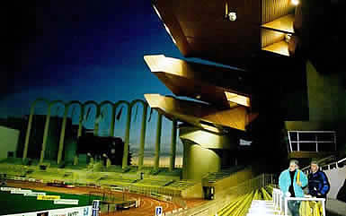 | Einlauf in das riesige Stadion. Diejenigen, die sich das ausdenken, ob in Monaco, in München oder in Stuttgart, stellen sich das so beeindruckend vor. Das ist es vielleicht für die ersten. Solche Stadien sind für Zehntausende von Zuschauern gebaut. Da läuft so ein Menschlein auf der noch nicht von den Fußballern abgerissenen Tartanbahn ins Ziel, ein paar verloren wirkende Gestalten haben auf den Läufer gewartet. Doch in Monaco werden die Katakomben genutzt. |