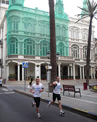 Nachdem man auch die sich hinter hohen Mauern versteckende Basis der spanischen Marine passiert hat, trennen sich Uferstraße und Promenade. Die Läufer halten sich rechts und folgen der Zweiteren entlang des Hafenbeckens, in dem Passagierfähren und Kreuzfahrtschiffe zu liegen kommen.