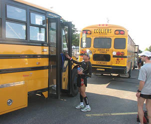 Busse übernehmen den Rest der Strecke. Das hat man auch bei anderen Gelegenheiten erlebt. Und auch die Farbe der Busse kennt man schon von anderswo. Es sind nämlich gelbe Busse. Busse, wie sie in ganz Nordamerika an jeden Morgen Kinder einsammeln und sie zu ihren Schulen bringen. Allerdings steht auf diesen „Ecoliers“ geschrieben. Und in dem Infoheft, das man mit den Startunterlagen bekam, ist auch davon die Rede, dass man in „Navettes“ einsteigen solle. Je me souviens.