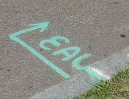 Denn nicht nur die Positionen der jeweiligen Kilometer sind schon vorher auf dem Asphalt markiert. Für jede einzelne Station und für jedes einzelne Angebot sind Anfangs- und Endpunkte auf die Straße gesprüht. Mit Richtungspfeilen wie bei Halteverbotsschildern. Da steht dann zum Beispiel „EAU“ für „Wasser“ oder das gar keine Übersetzung benötigende „GEL“. Wirklich stutzig macht allerdings der Text „EPO“. Doch nein, hier werden keine Dopingmittel verteilt. Die Helfer halten den Läufern nur Schwämme – französisch eben „éponges“ – entgegen.