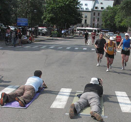 Selbstverständlich haben sich genau hier die Fotografen des Bilderdienstes aufgebaut, um jene spektakulären Aufnahmen zu schießen, die sie später an die Teilnehmer verkaufen wollen. Nur ist es nichts mit gemütlichem Sitzen auf dem Stühlchen. Um Läufer und Hotel vernünftig auf das gleiche Bild zu bekommen, muss man sich schon auf den Boden legen. Glücklicherweise kommen die Marathonis nur noch vereinzelt oder in ganz kleinen Gruppen und nicht im Riesenpulk an, sonst wäre das ein verdammt gefährlicher Job.