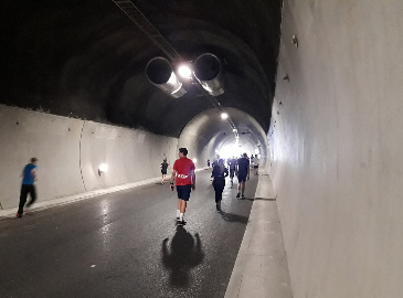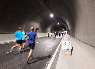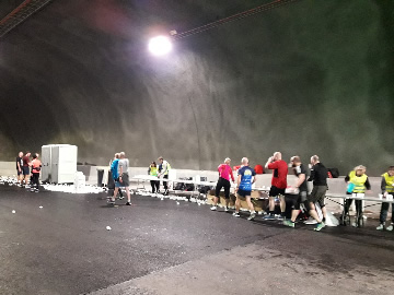 In Sachen Luftzufuhr brauchen wir uns keine Gedanken zu machen. Die ist prima, ebenso die Temperatur von 12 Grad. Die großen Turbinen an der Decke bewegen sich kaum und kommen erst zum Einsatz, wenn der Verkehr rollt. Jetzt rollt es erst mal für die Läufer, kilometerlang mit leichtem Gefälle. Langeweile kommt keine auf, zumindest bei mir nicht. Irgendwas entdeckt man immer, und dann kommt auch wieder ein Sanitätsposten oder eine Verpflegungsstelle. Wir sind in einer von zwei Tunnel-Röhren unterwegs, die zweite wird für Notfälle freigehalten.
